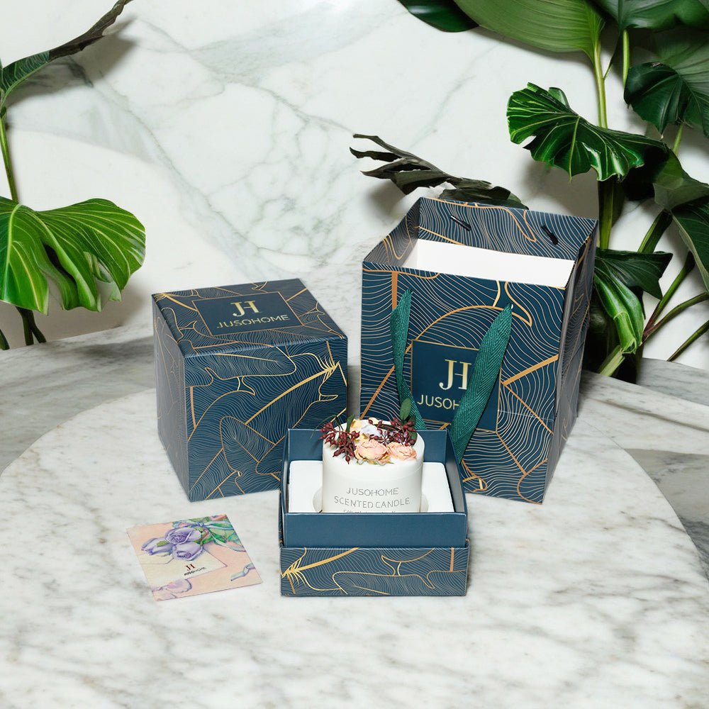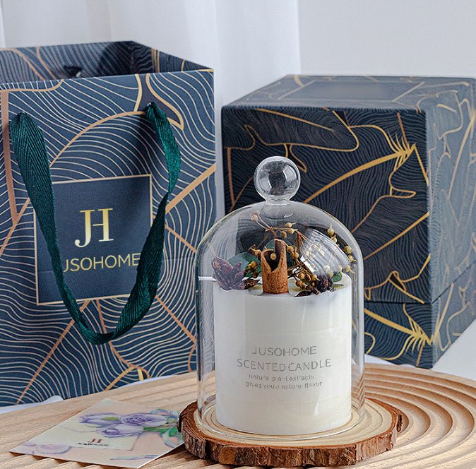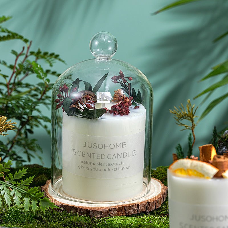 Our Dry Flower Soy Wax candle is made from pure soy wax topped with dried flowers and leaves for a classy, fairy-like look! With a potent throw, this candle will light up your room with an unforgettable aroma infused with scents from Firmenich Swiss imported essential oils. Made with a natural cotton wick, this candle provides a cleaner, smoother burn compared to others on the market and arrives in a kit with accessories to complete your setup: a glass bell jar snuffer, wood tray, and gift box/bag! Whether you're treating yourself to something nice or looking for a thoughtful present, our Dry Flower candle is a perfect choice and will make a lovely addition to your home, leaving you with a touch of nature and rich aroma you'll never want to end!